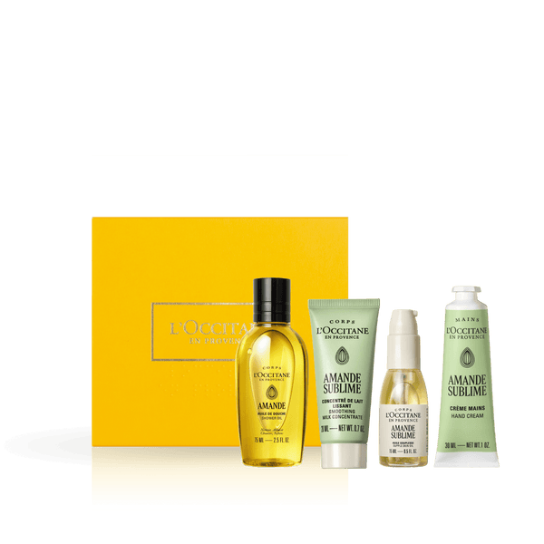 Uppgötvaðu hina vinsælu möndlulínu L’Occitane með þessu fallega Amande Sublime gjafasetti. Settið inniheldur minni stærðir af Almond Shower Oil, Almond Milk Concentrate, Almond Supple Skin Oil og Almond Hand Cream – fullkomið til að prófa línuna eða taka með í ferðalagið.
